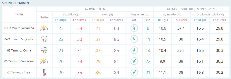PERŞEMBE gökgürültülü sağanak yağışlı 30 derece CUMA gökgürültülü sağanak yağışlı 31 derece CUMARTESİ parçalı bulutlu ve güneşli 33 derece PAZAR bunaltıcı sıcaklık 35 derece olacak.