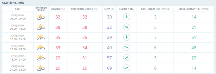 Akşam saatlerine doğru ise termometreler 33 derece olarak ölçülürken parçalı bulutlu gökyüzüyle birlikte gün batımı yaşanıyor. Akşam saatlerinde parçalı bulutlu gökyüzüyle birlikte termometreler 29 derece seviyelerinde ölçülüyor. Gece saatlerinde de parçalı bulutlu gökyüzüyle birlikte termometreler 26 derece seviyelerine kadar geriliyor.