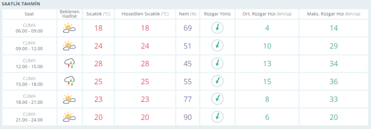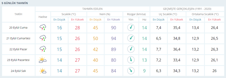 CUMARTESİ bölgesel sağanak yağışlı 26 derece PAZAR bölgesel sağanak yağışlı 26 derece PAZARTESİ parçalı bulutlu ve güneşli 27 derece SALI az bulutlu ve güneşli 27 derece olacak.
