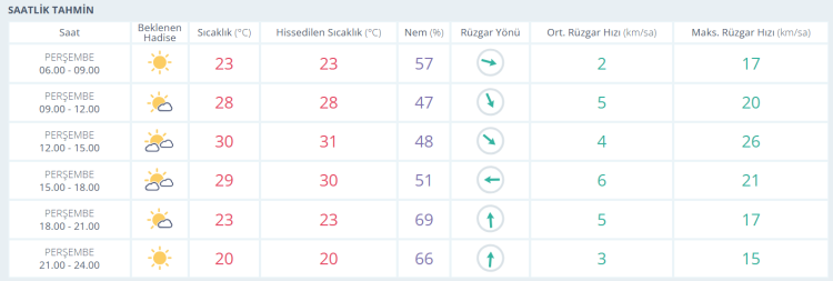 Öğle saatlerinde hava sıcaklığı 30 derece seviyelerinde seyrederken yine parçalı bulutlu bir hava öngörülüyor.