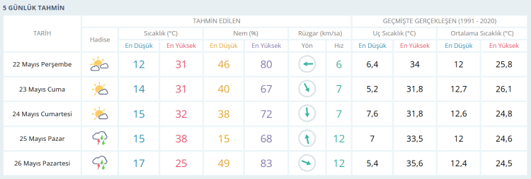 CUMA parçalı bulutluve 31 derece CUMARTESİ parçalı bulutlu 32 derece PAZAR gök gürültülü sağanak yağışlı 38 derece PAZARTESİ gök gürültülü sağanak yağışlı ve 25 derece olması bekleniyor.