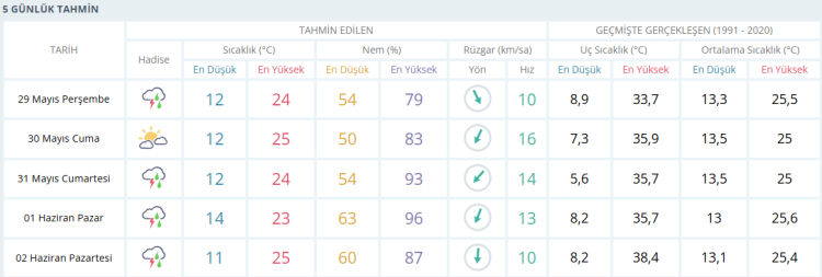 CUMA parçalı bulutluve 25 derece CUMARTESİ gök gürültülü sağanak yağış 24 derece PAZAR gök gürültülü sağanak yağış 23 derece PAZARTESİ gök gürültülü sağanak yağış ve 25 derece olması bekleniyor.