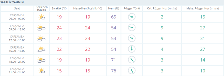 Akşamsaatlerinde termometreler 19 derece seviyelerinde ve az bulutlugösterirkengece saatlerinde ise 15 derece seviyelerinde ölçülüyor.