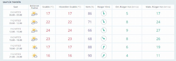SALI parçalı bulutlu ve güneşli 26 derece, ÇARŞAMBA az bulutlu ve güneşli 28 derece, PERŞEMBE gökgürültülü sağanak yağışlı 26 derece, CUMA gökgürültülü sağanak yağışlı 23 derece olacak.