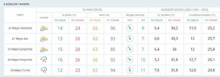 Buna göre 5 günlük hava durumu şu şekilde: