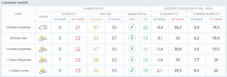 Haftanın üçüncü, Ramazan Bayramının ilk gününde (ÇARŞAMBA) sabah saatlerinde termometreler 8 derece olarak ölçülürken gün içerisinde parçalı bulutlu ve güneşli gökyüzüyle birlikte en yüksek sıcaklık 22 derece seviyelerinde ölçülecek.