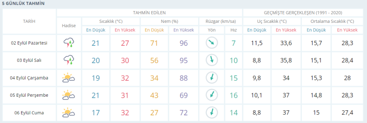 SALI parçalı bulutlu ve güneşli, bölgesel sağanak yağışlı30 derece ÇARŞAMBA parçalı bulutlu ve güneşli 32 derece PERŞEMBE parçalı bulutlu ve güneşli 31 derece CUMA parçalı bulutlu ve güneşli 32 derece olacak.