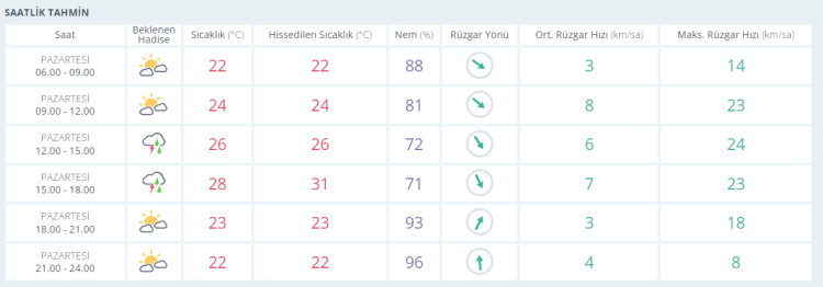 Akşam saatlerine doğru ise termometreler 28 derece olarak ölçülürken parçalı bulutlu birlikte gün batımı yaşanıyor. Akşamsaatlerinde parçalı bulutlu gökyüzüyle birlikte termometreler 23 derece seviyelerinde ölçülüyor. Gece saatlerinde de parçalı bulutlu gökyüzüyle birlikte termometreler 22 derece seviyelerine kadar geriliyor.