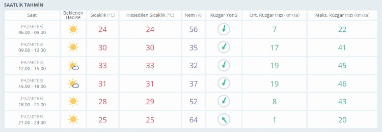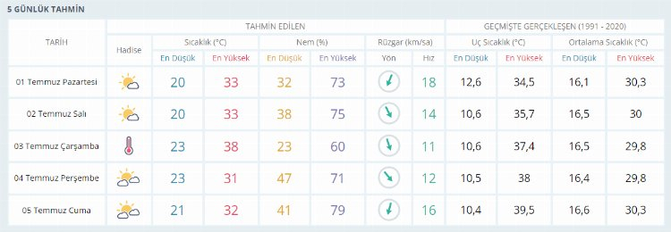 SALI az bulutlu ve güneşli 33 derece ÇARŞAMBA bunaltıcı sıcaklık 38 derece PERŞEMBE parçalı bulutlu ve güneşli 31 derece CUMA parçalı bulutlu ve güneşli 32 derece olacak.