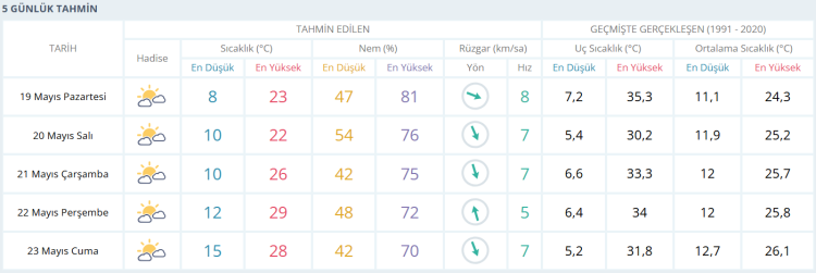 SALI parçalı bulutluve 22 derece ÇARŞAMBA parçalı bulutlu 26 derece PERŞEMBE parçalı bulutlu 29 derece CUMA parçalı bulutlu ve 28 derece olması bekleniyor.