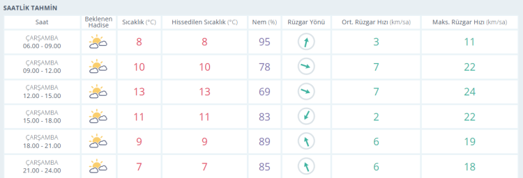 Gün içinde sıcaklıkların öğle saatlerinde 13 dereceye kadar yükselmesi öngörülürken, akşam saatlerinde 9 dereceye, gece saatlerinde ise 7 dereceye kadar düşeceği tahmin ediliyor.