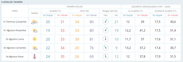 PERŞEMBE az bulutlu ve güneşli 33 derece CUMA açık ve bol güneşli 33 derece CUMARTESİ az bulutlu ve güneşli 34 derece PAZAR bunaltıcı 35 dereceolacak.