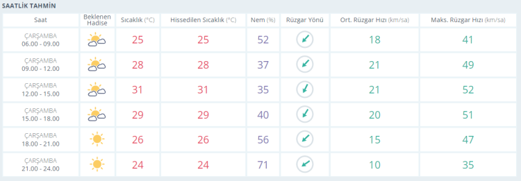 Akşam saatlerine doğru ise termometreler 29 derece olarak ölçülürken parçalı bulutlu ve güneşli gökyüzüyle birlikte gün batımı yaşanıyor. Akşam saatlerinde açık gökyüzüyle birlikte termometreler 26 derece seviyelerinde ölçülüyor. Gece saatlerinde de parçalı bulutlu gökyüzüyle birlikte termometreler 24 derece seviyelerine kadar geriliyor.