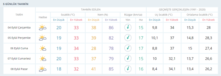 PERŞEMBE parçalı bulutlu ve güneşli 33 derece CUMA parçalı bulutlu ve güneşli 34 derece CUMARTESİ az bulutlu ve güneşli 33 derece PAZAR parçalı bulutlu ve güneşli 32 derece olacak.