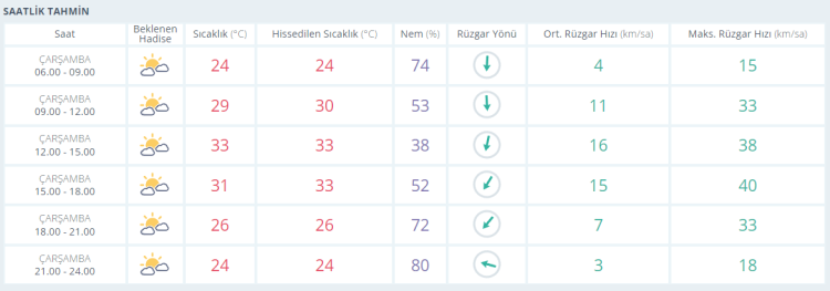 Akşam saatlerine doğru ise termometreler 31 derece olarak ölçülürken parçalı bulutlu gökyüzüyle birlikte gün batımı yaşanıyor. Akşam saatlerinde parçalı bulutlu gökyüzüyle birlikte termometreler 26 derece seviyelerinde ölçülüyor. Gece saatlerinde de parçalı bulutlu gökyüzüyle birlikte termometreler 24 derece seviyelerine kadar geriliyor.