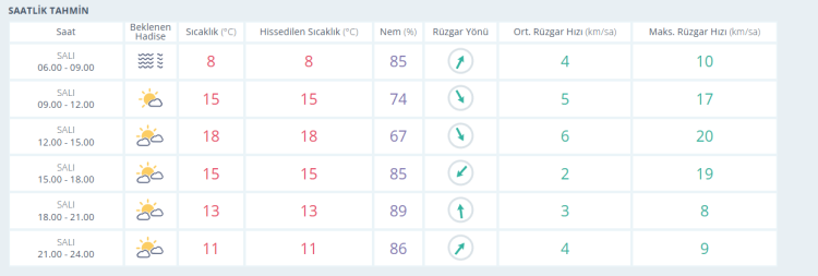 Akşam saatlerine doğru ise termometreler 15 derece olarak ölçülürken parçalı bulutlu gökyüzüyle birlikte gün batımı yaşanıyor. Akşamsaatlerinde de parçalı bulutlu gökyüzüyle birlikte termometreler 13 derece seviyelerinde ölçülüyor. Gece saatlerinde de parçalı bulutlu gökyüzüyle birlikte termometreler 11 derece seviyelerine kadar geriliyor.