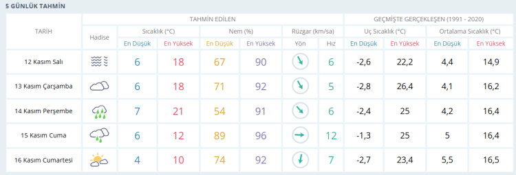 ÇARŞAMBA çok bulutlu 18 derece PERŞEMBE kuvvetli sağanak yağışlı 21 derece CUMA bölgesel yağmurlu ve çok bulutlu 12 derece CUMARTESİ parçalı bulutlu ve güneşli 10 derece olacak.