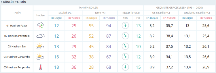 PAZARTESİ bulutluve 26 derece SALI parçalı bulutlu 29 derece ÇARŞAMBA parçalı bulutlu 32 derece PERŞEMBE parçalı bulutlu ve 36 derece olması bekleniyor.