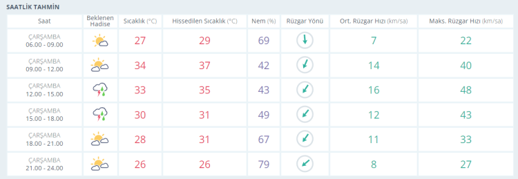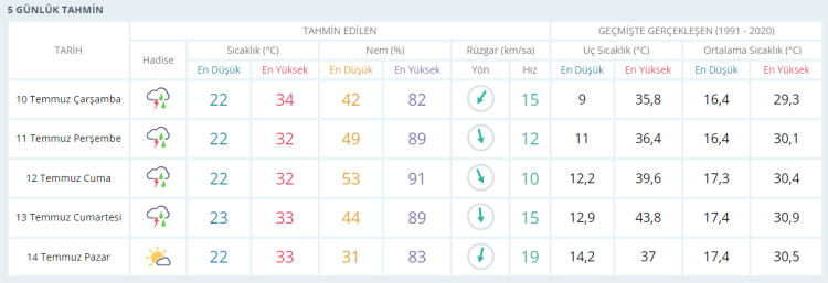 PERŞEMBE gökgürültülü sağanak yağışlı 32 derece CUMA gökgürültülü sağanak yağışlı 32derece CUMARTESİ gökgürültülü sağanak yağışlı 33derece PAZAR parçalı bulutlu ve güneşli 33 derece olacak.