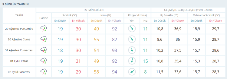 CUMARTESİ sağanak yağışlı 30 derece PAZAR sağanak yağışlı 31 derece PAZARTESİ sağanak yağışlı 29 derece olacak.