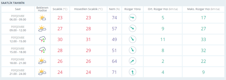 Akşam saatlerine doğru ise termometreler 28 derece olarak ölçülürken bölgesel etkili olan yağış geçişleriyle birlikte gün batımı yaşanıyor. Akşamsaatlerinde parçalı bulutlu gökyüzüyle birlikte termometreler 26 derece seviyelerinde ölçülüyor. Gece saatlerinde de parçalı bulutlu gökyüzüyle birlikte termometreler 24 derece seviyelerine kadar geriliyor.