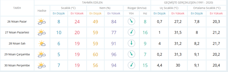 Meteoroloji Bursa için 26 Nisan (Pazar) hava tahmin raporunu yayınladı. Haftanın son gününde sıcaklıklar en yüksek 23 derece olurken gün boyunca açık ve sıcak bir hava etkili oluyor. Öte yandan sıcaklıklar yeni hafta da etkisini sürdürürken yağış beklenmiyor. İşte Bursa için 5 günlük hava durumu detayları...