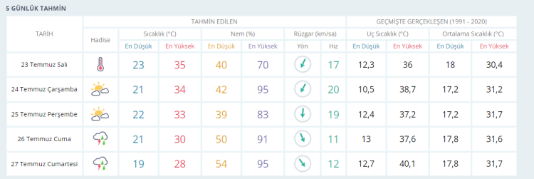 ÇARŞAMBA parçalı bulutlu ve güneşli 34 derece PERŞEMBE parçalı bulutlu ve güneşli 33 derece CUMA bölgesel sağanak yağışlı 30 derece CUMARTESİ bölgesel sağanak yağışlı 28 derece olacak.