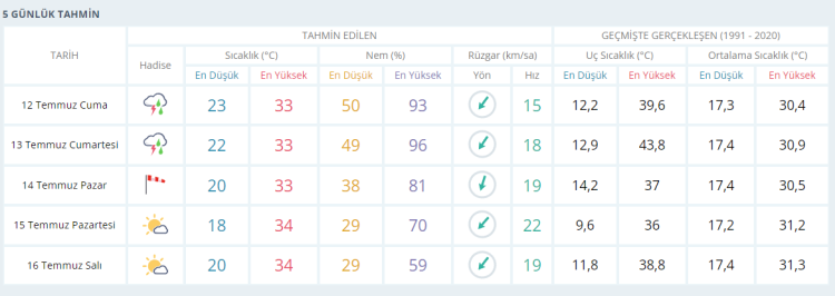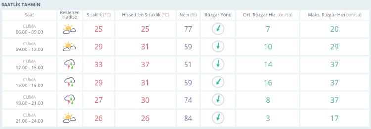 CUMARTESİ gökgürültülü sağanak yağışlı 33 derece PAZAR rüzgarlı ve parçalı bulutlu 33 derece PAZARTESİ az bulutlu ve güneşli34 derece SALI az bulutlu ve güneşli 34 derece olacak.
