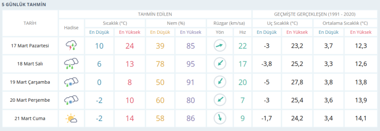 SALI sağanak yağışlı 13 derece ÇARŞAMBA karla karışık yağmurlu 8 derece PERŞEMBE karla karışık yağmurlu 10 derece CUMA güneşli ve 14 derece olması bekleniyor.