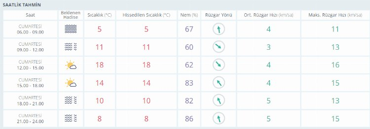 Haftanın ikinci ve yeni yılım ilk iş gününde ise (SALI) sabah saatlerinde sıcaklık 7 derece seviyelerinde ölçülüyor. Gün içerisinde yer yer yağış geçişleri ve çok bulutlu gökyüzüyle birlikte en yüksek sıcaklık ise 18 derece seviyelerinde seyrediyor.