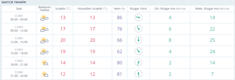 Akşam saatlerinde termometreler 14 derece seviyelerinde ve parçalı bulutlu gösterirken gece saatlerinde ise 12 derece seviyelerinde ölçülüyor.