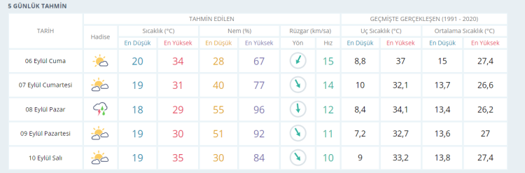 CUMARTESİ parçalı bulutlu ve güneşli 31 derece PAZAR parçalı bulutlu ve güneşli, bölgesel yağışlı 29 derece PAZARTESİ parçalı bulutlu ve güneşli 30 derece SALI parçalı bulutlu ve güneşli 35 derece olacak.