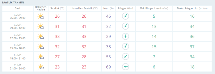 Akşam saatlerine doğru ise termometreler 32 derece olarak ölçülürken az bulutlu gökyüzüyle birlikte gün batımı yaşanıyor. Akşamsaatlerinde az bulutlu gökyüzüyle birlikte termometreler 27 derece seviyelerinde ölçülüyor. Gece saatlerinde de az bulutlu gökyüzüyle birlikte termometreler 23 derece seviyelerine kadar geriliyor.