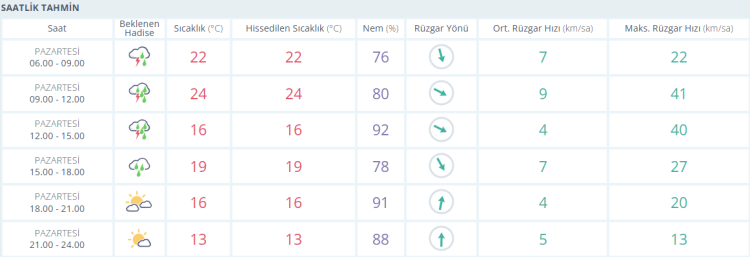 Akşam saatlerine doğru ise termometreler 19 derece ve sağanak yağışlı gösteriyor.