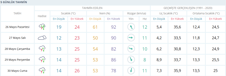 SALI bulutluve 23 derece ÇARŞAMBA gök gürültülü sağanak yağışlı ve 25 derece PERŞEMBE gök gürültülü sağanak yağışlı 25 derece CUMA gök gürültülü sağanak yağışlı ve 26 derece olması bekleniyor.