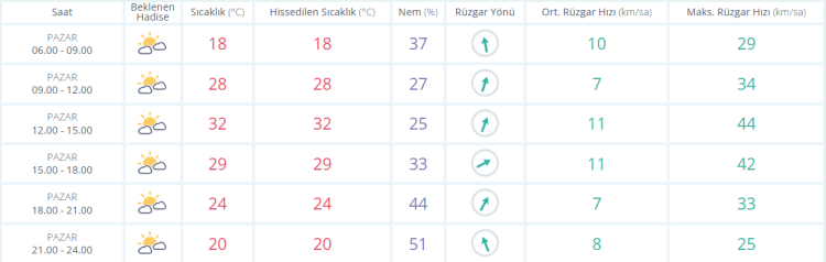 Bugün PAZAR sıcaklık gün içinde en yüksek 31 derece olarak ölçülürken sabah saatlerinde etkili olan parçalı bulutlu gökyüzü ile birlikte gün içerisinde güneşli hava etkili oluyor.