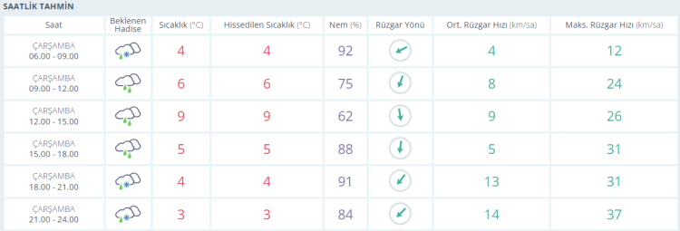 Akşam saatlerine doğru ise termometreler 5 derece olarak ölçülürken yağışlı ve çok bulutlu bir gökyüzü bekleniyor. Akşamsaatlerinde karla karışık yağmur ve çok bulutlu gökyüzüyle birlikte termometreler 4 derece seviyelerinde ölçülüyor. Gece saatlerinde de kar yağışı ve çok bulutlu gökyüzüyle birlikte termometreler 3 derece seviyelerinde ölçülüyor.