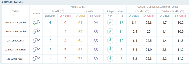 PERŞEMBE kar yağışlı ve çok bulutlu 4 derece CUMA kar yağışlı 4 derece CUMARTESİ kar yağışlı 3 derece PAZAR kar yağışlı 2 derece olması bekleniyor.