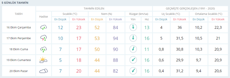 PERŞEMBE gökgürültülü sağanak yağışlı17 derece CUMA sağanak yağışlı 17 derece CUMARTESİ parçalı bulutlu ve güneşli 18 derece PAZAR çok bulutlu 20 derece olacak.