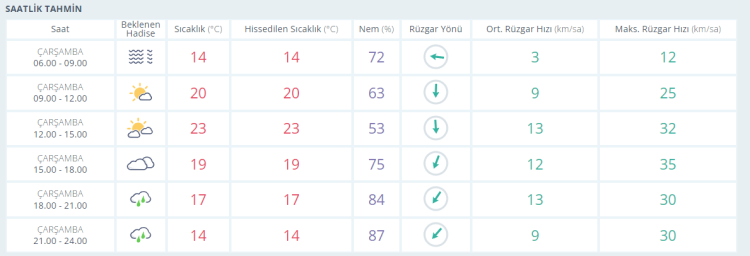 Akşam saatlerine doğru ise termometreler 19 derece olarak ölçülürken çok bulutlu gökyüzüyle birlikte gün batımı yaşanıyor. Akşamsaatlerinde de bölgesel hafif sağanak yağış geçişleriyle birlikte termometreler 17 derece seviyelerinde ölçülüyor. Gece saatlerinde de bölgesel hafif sağanak yağış geçişleriyle birlikte termometreler 14 derece seviyelerine kadar geriliyor.