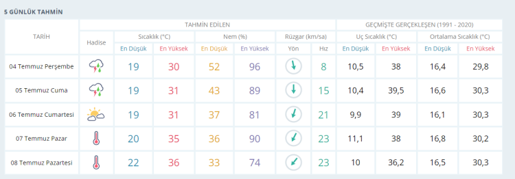 Buna göre 5 günlük hava durumu şu şekilde: