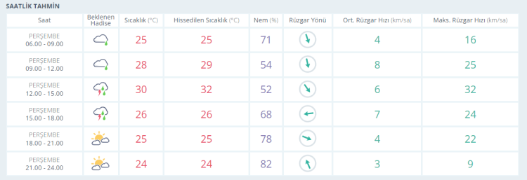 Öğle saatlerine doğru da bölgesel hafif yağış geçişli ve çok bulutlu gökyüzü ile birlikte termometreler 25 derece seviyelerinde seyrediyor.