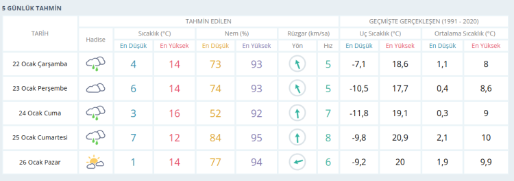 PERŞEMBE çok bulutlu 14 derece CUMA bölgesel yağışlı ve çok bulutlu 16 derece CUMARTESİ bölgesel yağışlı ve çok bulutlu 12 derece PAZAR parçalı bulutlu ve güneşli 14 derece olacak.