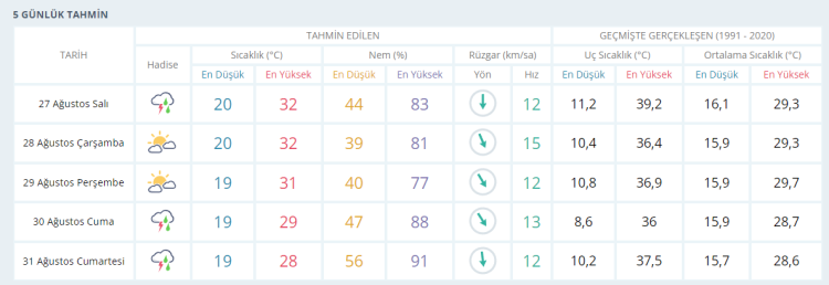 ÇARŞAMBA parçalı bulutlu ve güneşli 32 derece PERŞEMBE parçalı bulutlu ve güneşli 31 derece CUMA sağanak yağışlı 29 derece