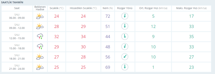 Akşam saatlerine doğru ise termometreler 29 derece olarak ölçülürken çok bulutlu gökyüzü ve bölgesel yağış geçişleriyle birlikte gün batımı yaşanıyor. Akşamsaatlerinde parçalı bulutlu gökyüzüyle birlikte termometreler 27 derece seviyelerinde ölçülüyor. Gece saatlerinde de parçalı bulutlu gökyüzüyle birlikte termometreler 25 derece seviyelerine kadar geriliyor.