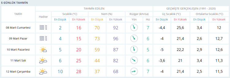 PAZAR sisli 15 derece PAZARTESİ güneşli 20 derece SALI güneşli 25 derece ÇARŞAMBA güneşli ve 28 derece olması bekleniyor.