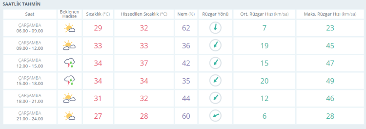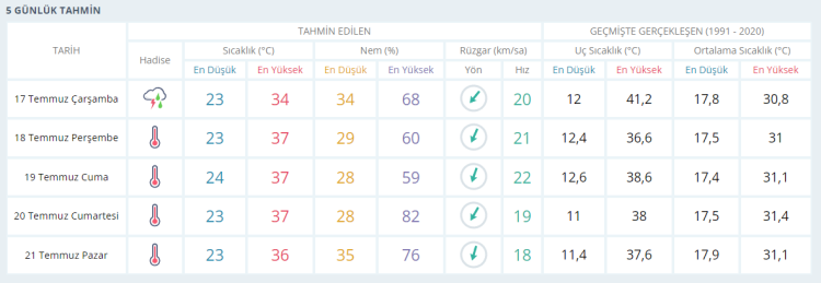 PERŞEMBE bunaltıcı sıcaklık 37 derece CUMA bunaltıcı sıcaklık37 derece CUMARTESİ bunaltıcı sıcaklık 37 derece PAZAR bunaltıcı sıcaklık 36 derece olacak.