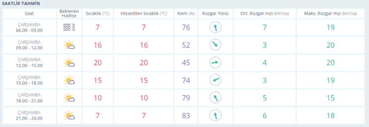 Akşam saatlerine doğru ise termometreler 15 derece olarak ölçülürken az bulutlu gökyüzüyle birlikte gün batımı yaşanıyor. Akşam saatlerinde az bulutlu gökyüzüyle birlikte termometreler 10 derece seviyelerinde ölçülüyor. Gece saatlerinde de az bulutlu gökyüzüyle birlikte termometreler 7 derece seviyelerinde ölçülüyor.