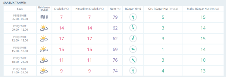 Akşam saatlerine doğru ise termometreler 15 derece olarak ölçülürken parçalı bulutlu gökyüzüyle birlikte gün batımı yaşanıyor. Akşamsaatlerinde parçalı bulutlu gökyüzüyle birlikte termometreler 11 derece seviyelerinde ölçülüyor. Gece saatlerinde de parçalı bulutlu gökyüzüyle birlikte termometreler 9 derece seviyelerinde ölçülüyor.