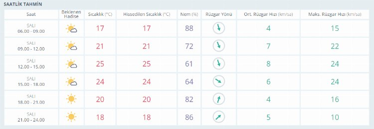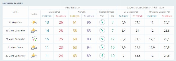 ÇARŞAMBA parçalı bulutlu ve güneşli 28 derece, PERŞEMBE gökgürültülü sağanak yağışlı 25 derece, CUMA parçalı bulutlu ve güneşli 23 derece, CUMARTESİ parçalı bulutlu ve güneşli 24 derece olacak.